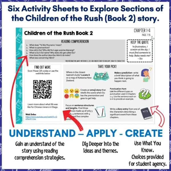 This novel study accompanies Children of the Rush (Book 2) by James Russell, continuing the gripping adventures in Gabriel’s Gully during the 1860s Otago gold rush. After the intense events of the first book, Michael, Atarangi, and Siu—three close friends—face even greater dangers. Children of the Rush (Book 2) deepens the themes explored in the first installment, further examining issues of social injustice, bravery under challenging times, and the unbreakable bonds of friendship.