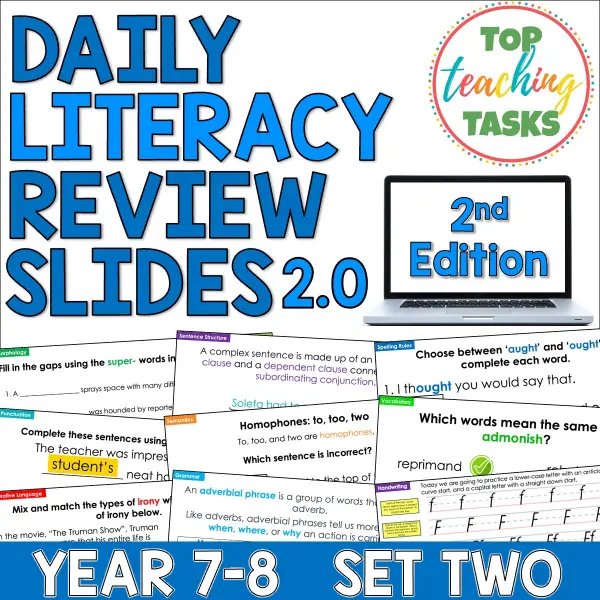 - Each set of Daily Literacy Review Slides for Year 7-8 includes nine weeks of literacy review slides. Each week features four sets of slides. In total, you receive 36 sets of daily review slides. With this bundle, you have enough daily literacy review slides for the entire year!