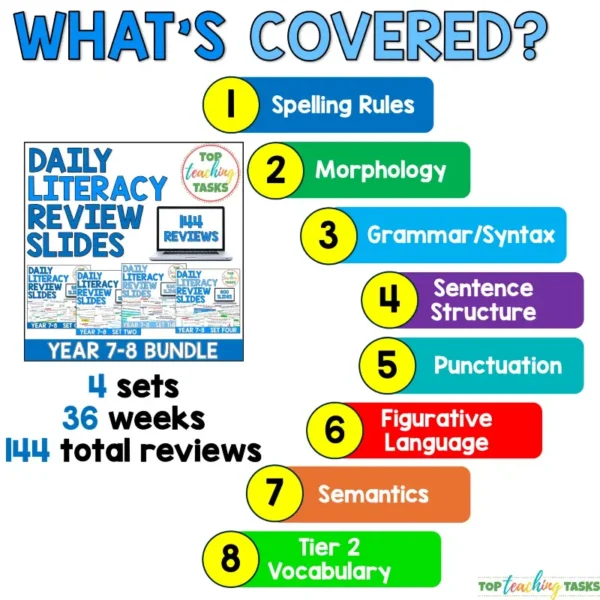 Each set of Daily Literacy Review Slides for Year 7-8 includes nine weeks of literacy review slides. Each week features four sets of slides. In total, you receive 36 sets of daily review slides. With this bundle, you have enough daily literacy review slides for the entire year!