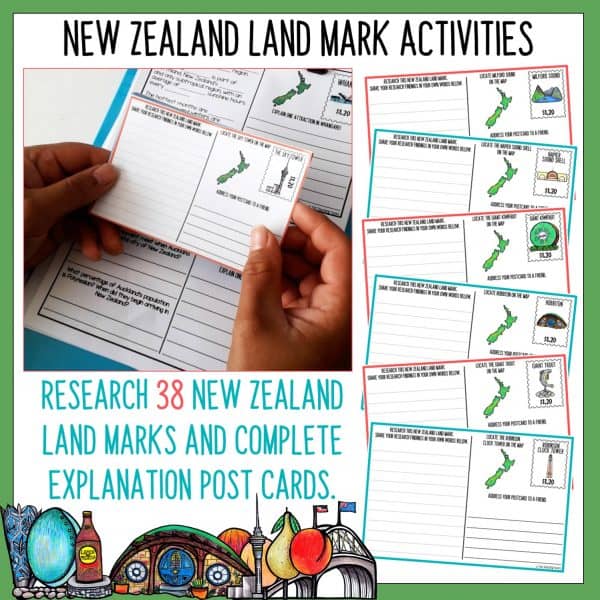 - 38 research skills postcards based on iconic New Zealand landmarks