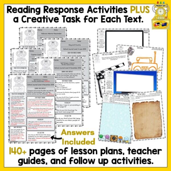 Dive deep into New Zealand’s collective history with our New Zealand History Reading Bundle. Imagine your students have been taken back in time in a time machine. To get back to the present day, they need to complete tasks and collect mosaic tiles. Once their mosaic tiles are complete, they can use the time machine to get home. They read 19 current (2014-2021) School Journals and learn about interesting parts of New Zealand history. They complete activities that promote higher-order thinking and the use of reading comprehension strategies.