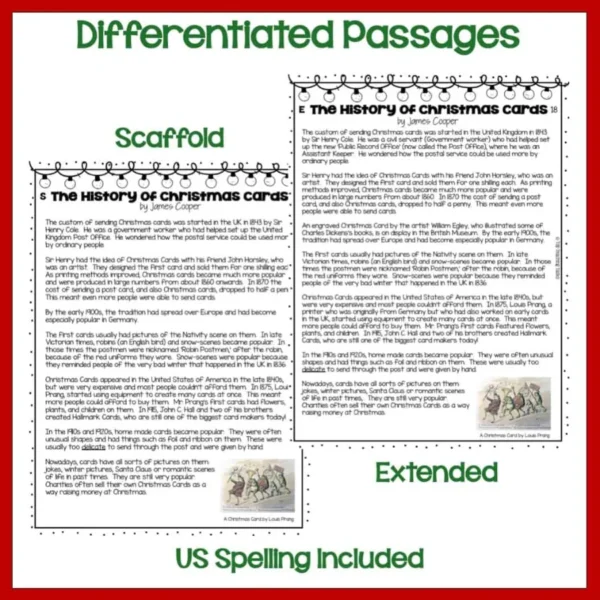 Learn about one of the traditions of Christmas with this informational Christmas text about The History of Christmas Cards! This Grade Four and Grade Five Christmas-themed differentiated passage will engage your students while reinforcing important reading skills. These are great reading comprehension activities for guided reading!