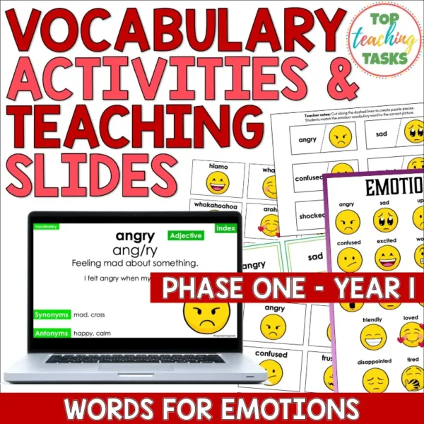 Our Emotions Vocabulary Slides and Hands-On Activities are a dynamic and effective tool for exploring word meanings. These slides, flashcards and visual aids are a great companion to your structured literacy programme. Expanding students’ vocabulary is crucial for improving their reading and writing skills. Studies have shown that students with larger vocabularies perform better in school, especially in reading.
