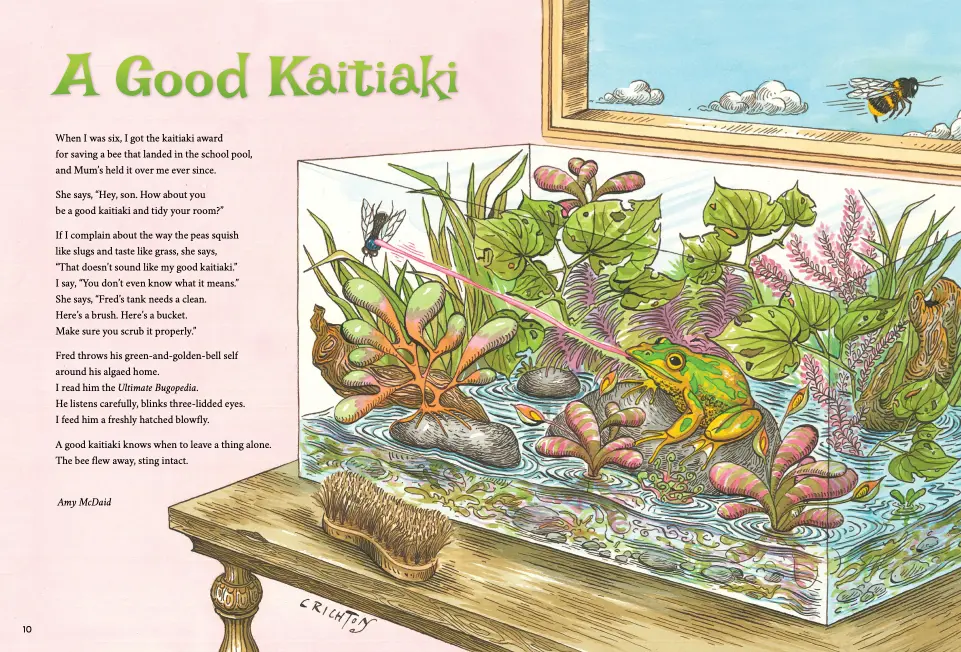 In this poem, a young narrator humorously describes how his mother uses a childhood award for saving a bee to guilt-trip him into chores like tidying his room and cleaning the tank of his frog, Fred.